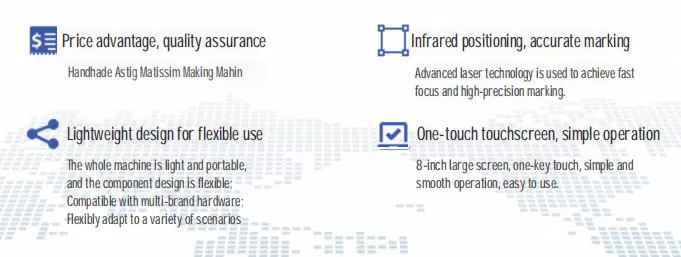 Handheld laser marking machine, designed to solve various marking difficulties. Advanced lasertechnology is used to achieve fast focus adjustment and high-precision marking. With a highly integrateddesign, the fuselage is small and lightweight, and the detachable design of the battery can last unlimitedand improve work efficiency. Handheld laser marking equipment has a wider range of use and greaterflexibility,which can meet the daily needs of customers.